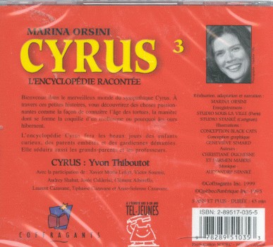 Marina Orsini présente Cyrus, l’encyclopédie racontée ; cette encyclopédie « audio » regroupe les questions les plus pertinentes posées par les enfants à la célèbre émission radiophonique 275-Allô diffusée par la Société Radio-Canada depuis 1989.