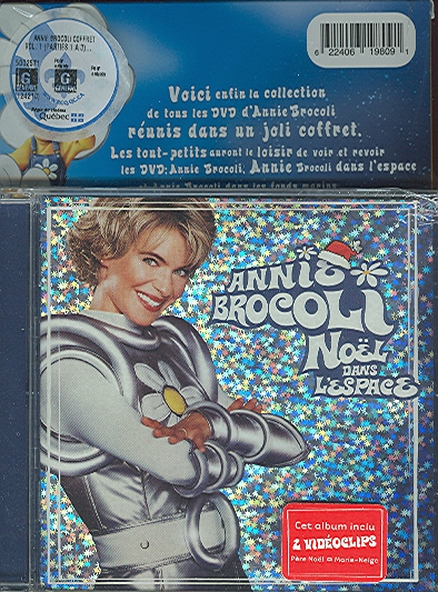 Disponible en quantité limitée, voilà enfin la collection de tous les DVD d’Annie Brocoli réunie dans un joli coffret. Les tout-petits auront le loisir de voir et revoir les DVD Annie Brocoli, Annie Brocoli dans l’espace et Annie Brocoli dans les fonds marins. La belle Annie y interprète 29 chansons qui totalisent trois heures de plaisir garanti! De plus, tous les DVD contiennent des « bloopers » et du karakoé. En prime, le cd Noël dans l’espace est offert et propose 13 chansons originales. Un cadeau idéal pour le temps des Fêtes!