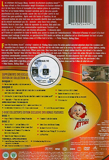 From the Academy Award(R) winning creators of FINDING NEMO (2003 Best Animated Feature Film) comes the action-packed animated adventure about the mundane and incredible lives of a house full of superheroes. Bob Parr and his wife Helen used to be among the world's greatest crime fighters, saving lives and battling evil on a daily basis. Fifteen years later, they have been forced to adopt civilian identities and retreat to the suburbs where they live "normal" lives with their three kids, Violet, Dash, and Jack-Jack. Itching to get back into action, Bob gets his chance when a mysterious communication summons him to a remote island for a top secret assignment. He soon discovers that it will take a super family effort to rescue the world from total destruction. Exploding with fun and featuring an all-new animated short film, this spectacular 2-disc collector's edition DVD is high-flying entertainment for everyone.