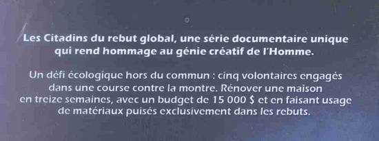 Un défi écologique hors du commun: cinq volontaires engagés dans une course contre la montre. Rénover une maison en treize semaines, avec un budget de 15 000 $ et en faisant usage de matériaux puisés exclusivement dans les rebuts.