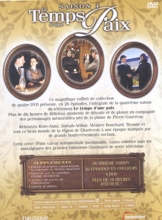 Ce magnifique coffret de collection de quatre DVD présente, en 26 épisodes, l'intégrale de la quatrième saison du téléroman Le temps d'une paix.