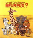 Une question sur le sens de la vie posée sur le rabat, deux réponses envisageables en image sur la double page : un livre sur l'apprentissage du bonheur.