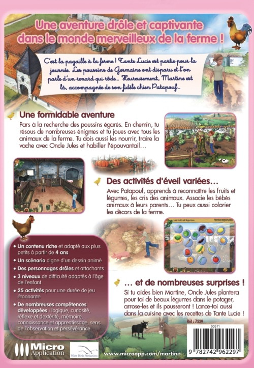 Micro Application lance le jeu Martine à la ferme, un CD-ROM ludo-éducatif captivant et plein de surprises pour les petites filles de 4 à 7 ans. L'enfant joue dans la peau de Martine. Un grand jeu d'éveil et d'aventures en 3D animée, des activités scénarisées et des récompenses motivantes.
