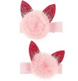 2 pinces à cheveux recouvertes de tissu avec oreilles roses pailletées et pompons moelleux.