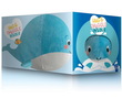 Une peluche en forme de baleine avec un livre aux pages brodées sur le ventre pour accompagner les tout-petits dans les moments de jeux ou pendant la sieste.
