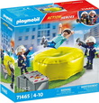 Appel d'urgence à la caserne des pompiers ! Comprend trois personnages, un coussin de sauvetage se gonflant et se dégonflant et se plie et range dans la boite et des accessoires.