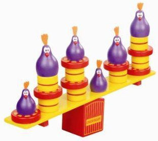Jeu d'adresse en bois pour 2 à 4 joueurs. Comprend une plateforme, un socle, 6 poules, 7 bottes de foin et 7 roues de charrettes valant de 1 à 3 points. On place tous les éléments sur la plateforme, puis on la met en équilibre sur son socle. À tour de rôle, les joueurs enlèvent une pièce en essayant de ne pas faire basculer la plateforme. Celui qui a le plus de points gagne.