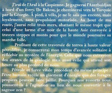 J'irai de l'Aral à la Caspienne. Je gagnerai l'Azerbaïdjan à bord d'un ferry. De Bakou, je cheminerai vers la Turquie par la Géorgie. A pied, à vélo, je ne le sais pas encore, mais loyalement, sans propulsion motorisée. Au bout de ma route, j'aurai relié trois mers, abattant le même trajet que celui d'une larme d'or noir de la haute Asie convoyée à travers steppes et monts pour que le monde poursuive sa marche folle. Profitant de cette traversée de terres à hautes valeurs pétrolifère, je consacrerai mon temps d'avancée solitaire à réfléchir au mystère de l'énergie. celle que nous extrayons des strates de la géologie mais aussi celle qui attend son heure au plus profond de nous. Pétrole et force vitale procèdent du même principe : l'être humain recèle un gisement d'énergie que des forages propices peuvent faire jaillir. Pourquoi nos ressorts nous poussent-ils à l'agitation au lieu de nous convertir à la sagesse zen ?