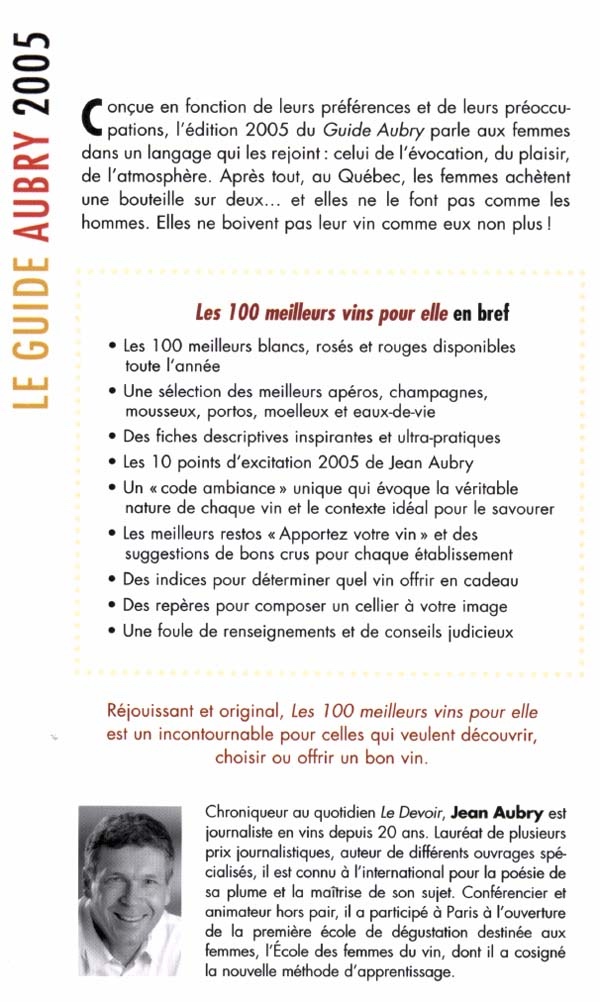 Conçue en fonction de leurs préférences et de leurs préoccupations, l’édition 2005 du Guide Aubry parle aux femmes dans un langage qui les rejoint: celui de l’évocation, du plaisir, de l’atmosphère. Après tout, au Québec, les femmes achètent une bouteille sur deux... et elles ne le font pas comme les hommes. Elles ne boivent pas leur vin comme eux non plus!