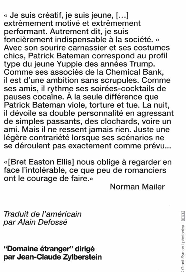 " Je suis créatif, je suis jeune, [...] extrêmement motivé et extrêmement performant. Autrement dit, je suis foncièrement indispensable a la société ". Avec son sourire carnassier et ses costumes chics, Patrick Bateman correspond au profil type du jeune Yuppie des années Trump. Comme ses associés de la Chemical Bank, il est d'une ambition sans scrupules. Comme ses amis, de il rythme ses soirées-cocktails pauses cocaïne. À la seule différence que Patrick Bateman viole torture et tue. La nuit, il dévoile sa double personnalité en agressant de simples passants, des clochards, voire un ami. Mais il ne ressent jamais rien. Juste une légère contrariété lorsque ses scénarios ne se déroulent pas exactement comme prévu...