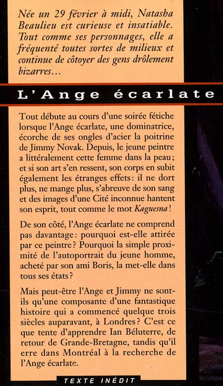 Tout débute au cours d'une soirée fétiche lorsque l'Ange écarlate, une dominatrice, écorche de ses ongles d'acier la poitrine de Jimmy Novak. Depuis, le jeune peintre a littéralement cette femme dans la peau ; et si son art s'en ressent, son corps en subit également les étranges effets : il ne dort plus, ne mange plus, s'abreuve de son sang et des images d'une Cité inconnue hantent son esprit, tout comme le mot Kaguesna ! De son côté, l'Ange écarlate ne comprend pas davantage : pourquoi est-elle attirée par ce peintre ? Pourquoi la simple proximité de l'autoportrait du jeune homme, acheté par son ami Boris, la met-elle dans tous ses états ? Mais peut-être l'Ange et Jimmy ne sont-ils qu'une composante d'une fantastique histoire qui a commencé quelque trois siècles auparavant, à Londres ? C'est ce que tente d'apprendre Ian Béluterre, de retour de Grande-Bretagne, tandis qu'il erre dans Montréal à la recherche de l'Ange écarlate.