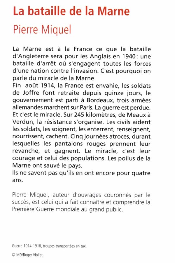 La Marne est à la France ce que la bataille d'Angleterre sera pour les Anglais en 1940 : une bataille d'arrêt où s'engagent toutes les forces d'une nation contre l'invasion. C'est pourquoi on parle du miracle de la Marne. Fin août 1914, la France est envahie, les soldats de Joffre font retraite depuis quinze jours, le gouvernement est parti à Bordeaux, trois armées allemandes marchent sur Paris. La guerre est perdue. Et c'est le miracle. Sur 245 kilomètres, de Meaux à Verdun, la résistance s'organise. Les civils aident les soldats, les soignent, les enterrent, renseignent, nourrissent, cachent. Cinq journées atroces, durant lesquelles les pantalons rouges prennent leur revanche, et gagnent. Le miracle, c'est leur courage et celui des populations. Les poilus de la Marne ont sauvé le pays. Ils ne savent pas qu'ils en ont encore pour quatre ans.