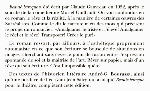 Beauté baroque est la chronique au jour le jour d’une passion, celle que l’écrivain et poète Claude Gauvreau, disparu en 1971, a éprouvé pour la comédienne Muriel Guilbeault, qui se suicida en 1952. Un jeune homme est habité tout entier par “la plus fière, la plus douce, la plus étrange des passions” pour une actrice rousse, “éternelle désirée”, femme inaccessible et blessée à mort par la loi d’un autre homme. Le chant d’amour de Gauvreau – il a 27 ans quand il écrit ce premier roman – a des accents d’une naïveté bouleversante. La mort de la “déesse” ne délivrera pas le poète, dont la vie et l’œuvre seront marquées au sceau de cet amour fou qui a aujourd’hui rejoint la légende.