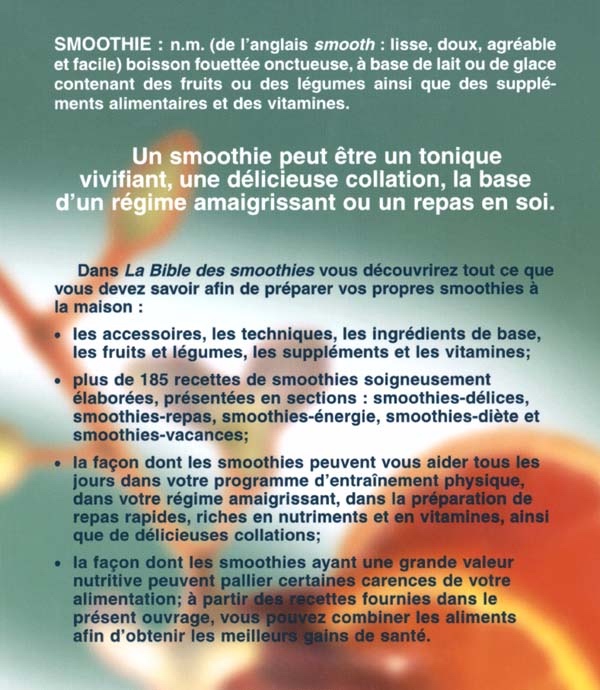 - plus de 185 recettes de smoothies soigneusement élaborées, présentées en sections : smoothies-délices, smoothies-repas, smoothies-énergie, smoothies-diète et smoothies-vacances;
