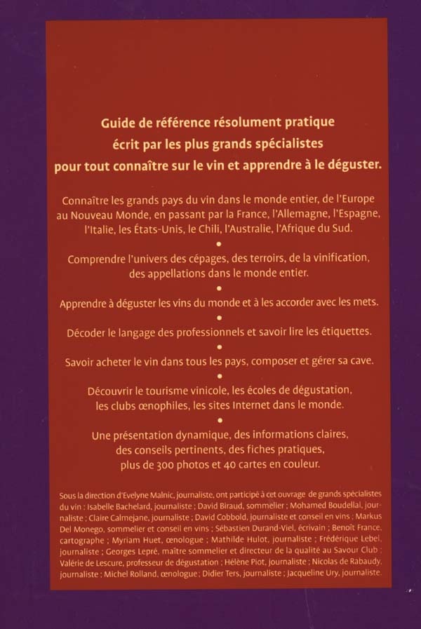 Connaître les grands pays du vin dans le monde entier, de l'Europe au Nouveau Monde, en passant par la France, l'Allemagne, l'Espagne, l'Italie, les Etats-Unis, le Chili, l'Australie, l'Afrique du Sud. Comprendre l'univers des cépages, des terroirs, de la vinification, des appellations dans le monde entier. Apprendre à déguster les vins du monde et à les accorder avec les mets. Décoder le langage des professionnels et savoir lire les étiquettes. Savoir acheter le vin dans tous les pays, composer et gérer sa cave. Découvrir le tourisme vinicole, les écoles de dégustation, les clubs oenophiles, les sites internet dans le monde. Une présentation dynamique, des informations claires, des conseils pertinents, des fiches pratiques, plus de 300 photos et 40 cartes en couleur.