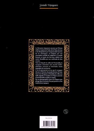 La Birmanie, largement ouverte sur l'océan indien et séparée de l'Inde, de la Chine, du Laos et du Bengladesh par l'impénétrable barrière de ses montagnes, est baignée par une une atmosphère paisible de religiosité. Le peuple birman, en quête du Nirvana, célébre son maître Bouddha par une multitude de rites vivants.. Tout au long de la vallée de l'Irrawaddy, le voyageur rencontre une société multi-ethnique, ouverte et souriante, toute imprégnée de son karma.. C'est en parcourant cet axe que le voyageur découvre l'histoire du peuple birman. Il visite tour à tour Rangoon et Mandalay, les villes aux mille pagodes et la plaine de Pagan couverte d'innombrables temples et stupas.. Par ses photographies, Jean-Léo Dugast nous plonge dans la sérénité d'un pays préservé d'un modernisme tapageur..