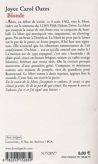 Alors, en début de soirée, ce 3 août 1962, vint la Mort, index sur la sonnette du 12305 Fifth Helena Drive. La Mort qui essuyait la sueur de son front avec sa casquette de base-ball.. La Mort qui mastiquait vite, impatiente, un chewing-gum. Pas un bruit à l'intérieur.. La Mort ne peut pas le laisser sur le pas de la porte, ce foutu paquet, il lui faut une signature.. Elle n'entend que les vibrations ronronnantes de l'air conditionné. Ou bien... est-ce qu'elle entend une radio là ? La maison est de type espagnol, c'est une «hacienda» de plain-pied ; murs en fausses briques, toiture en tuiles orange luisantes, fenêtres aux stores tirés. On la croirait presque recouverte d'une poussière grise. Compacte et miniature comme une maison de poupée, rien de grandiose pour Brentwood.. La Mort sonna à deux reprises, appuya fort la seconde.. Cette fois, on ouvrit la porte.. De la main de la Mort, j'acceptais ce cadeau. Je savais ce que c'était, je crois. Et de la part de qui c'était. En voyant le nom et l'adresse, j'ai ri et j'ai signé sans hésiter. . J. C. O..