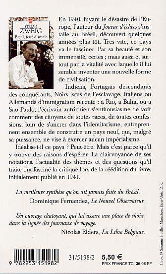 Le Brésil, terre d'avenir . En 1940, fuyant le désastre de l'Europe, l'auteur du Joueur d'échecs s'installe au Brésil, découvert quelques années plus tôt. Très vite, ce pays va le fasciner. Par sa beauté et son immensité, certes ; mais aussi et surtout par la vitalité avec laquelle il lui semble inventer une nouvelle forme de civilisation.. Indiens, Portugais, descendants des conquérants. Noirs issus de l'esclavage, Italiens ou Allemands d'immigration récente : à Rio, à Bahia ou à São Paulo, l'écrivain autrichien s'enthousiasme de voir comment des citoyens de toutes races, de toutes confessions, loin de s'ancrer dans l'identitarisme, entreprennent ensemble de construire un pays neuf.. La clairvoyance de ses notations, l'actualité des thèmes et des questions qu'il traite ont fasciné la critique lors de la réédition du livre, initialement publié en 1941.. La meilleure synthèse qu'on ait jamais faite du Brésil. Dominique Fernandez, Le Nouvel Observateur.. Un ouvrage chatoyant, qui lui assure une place de choix dans la lignée des journaux de voyage. Nicolas Elders, La Libre Belgique..
