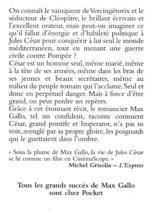 On connaît le vainqueur de Vercingétorix et le séducteur de Cléopâtre, le brillant écrivain et l'excellent orateur, mais peut-on imaginer ce qu'il fallut d'énergie et d'habileté politique à Jules César pour conquérir à lui seul le monde méditerranéen, tout en menant une guerre civile contre Pompée ? César est un homme seul, même marié, même à la tête de ses armées, même dans les bras de ses jeunes et beaux secrétaires, même au milieu du peuple romain qui l'acclame. Seul et donc en perpétuel danger. Mais à force d'être grand, on peut perdre ses repères. Grâce à cet étonnant récit, le romancier Max Gallo, tel un confident, raconte comment César, grand pontife et Imperator, n'a pas su voir, aveuglé par sa propre gloire, les poignards qui le guettaient dans l'ombre.