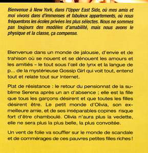 Bienvenue à New York, dans l'Upper East Side, où mes amis et moi vivons dans d'immenses et fabuleux appartements, où nous fréquentons les écoles privées les plus sélectes. Nous ne sommes pas toujours des modèles d'amabilité, mais nous avons le physique et la classe, ça compense. Bienvenue dans un monde de jalousie, d'envie et de trahison où se nouent et se dénouent les amours et les amitiés - le tout sous l'oeil de lynx et la langue de p... de la mystérieuse Gossip Girl qui voit tout, entend tout et relate tout sur Internet. Plat de résistance : le retour du pensionnat de la sublime Serena après un an d'absence ; elle est la fille que tous les garçons désirent et que toutes les filles désirent être. Le petit monde d'Olivia, son ex-meilleure amie, et de ses inséparables copines risque fort d'être chamboulé. Olivia n'aura plus la vedette, elle ne sera plus la plus belle, la plus convoitée. Un vent de folie va souffler sur le monde de scandale et de commérages de ces pauvres petites filles riches !