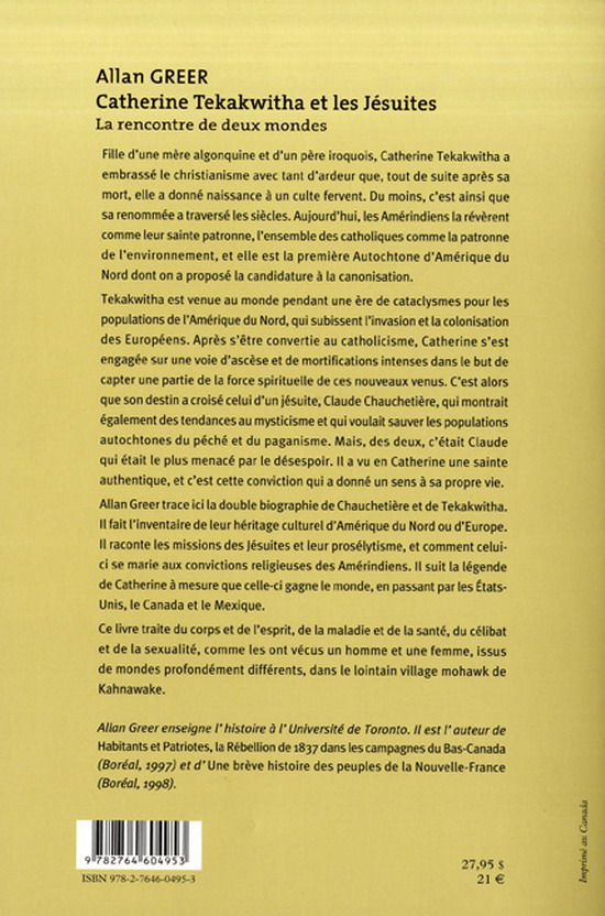 Fille d'une mère algonquine et d'un père iroquois, Catherine Tekakwitha a embrassé le christianisme avec tant d'ardeur que, tout de suite après sa mort, elle a donné naissance à un culte fervent. Du moins, c'est ainsi que sa renommée a traversé les siècles. Aujourd'hui, les Amérindiens la révèrent comme leur sainte patronne, l'ensemble des catholiques comme la patronne de l'environnement, et elle est la première Autochtone d'Amérique du Nord dont on a proposé la candidature à la canonisation. Tekakwitha est venue au monde pendant une ère de cataclysmes pour les populations de l'Amérique du Nord, qui subissent l'invasion et la colonisation des Européens. Après s'être convertie au catholicisme, Catherine s'est engagée sur une voie d'ascèse et de mortifications intenses dans le but de capter une partie de la force spirituelle de ces nouveaux venus. C'est alors que son destin a croisé celui d'un jésuite, Claude Chauchetière, qui montrait également des tendances au mysticisme et qui voulait sauver les populations autochtones du péché et du paganisme. Mais, des deux, c'était Claude qui était le plus menacé par le désespoir. Il a vu en Catherine une sainte authentique, et c'est cette conviction qui a donné un sens à sa propre vie. Allan Greer trace ici la double biographie de Chauchetière et de Tekakwitha. Il fait l'inventaire de leur héritage culturel d'Amérique du Nord ou d'Europe. Il raconte les missions des Jésuites et leur prosélytisme, et comment celui-ci se marie aux convictions religieuses des Amérindiens. Il suit la légende de Catherine à mesure que celle-ci gagne le monde, en passant par les États-Unis, le Canada et le Mexique. Ce livre traite du corps et de l'esprit, de la maladie et de la santé, du célibat et de la sexualité, comme les ont vécus un homme et une femme, issus de mondes profondément différents, dans le lointain village mohawk de Kahnawake.