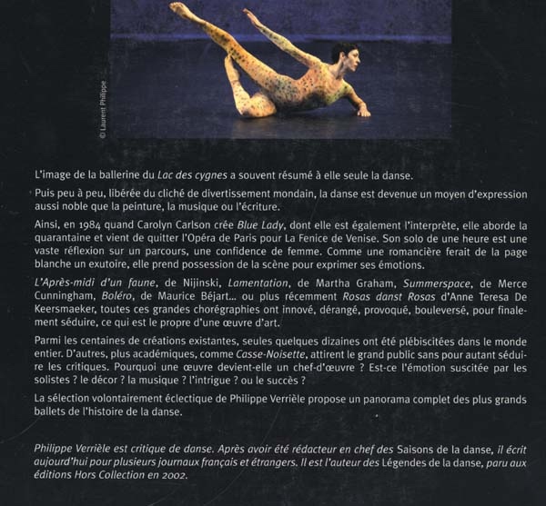 L'image de la ballerine du Lac des cygnes a souvent résumé à elle seule la danse. Puis peu à peu, libérée du cliché de divertissement mondain, la danse est devenue un moyen d'expression aussi noble que la peinture, la musique ou l'écriture. Ainsi, en 1984 quand Carolyn Carlson crée Blue Lady, dont elle est également l'interprète, elle aborde la quarantaine et vient de quitter l'Opéra de Paris pour La Fenice de Venise. Son solo de une heure est une vaste réflexion sur un parcours, une confidence de femme. Comme une romancière ferait de la page blanche un exutoire, elle prend possession de la scène pour exprimer ses émotions. L'Après-midi d'un faune, de Nijinski, Lamentation, de Martha Graham, Summerspace, de Merce Cunningham, Boléro, de Maurice Béjart... ou plus récemment Rosas danst Rosas d'Anne Teresa De Keersmaeker, toutes ces grandes chorégraphies ont innové, dérangé, provoqué, bouleversé, pour finalement séduire, ce qui est le propre d'une œuvre d'art. Parmi les centaines de créations existantes, seules quelques dizaines ont été plébiscitées dans le monde entier. D'autres, plus académiques, comme Casse-Noisette, attirent le grand public sans pour autant séduire les critiques. Pourquoi une œuvre devient-elle un chef-d'œuvre ? Est-ce l'émotion suscitée par les solistes ? le décor ? la musique ? l'intrigue ? ou le succès ? La sélection volontairement éclectique de Philippe Verrièle propose un panorama complet des plus grands ballets de l'histoire de la danse.