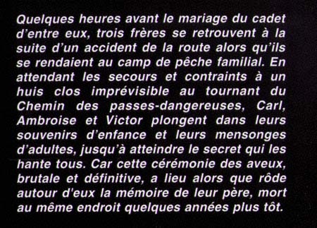 Quelques heures avant le mariage du cadet d’entre eux, trois frères se retrouvent à la suite d’un accident de la route alors qu’ils se rendaient au camp de pêche familial. En attendant les secours et contraints à un huis clos imprévisible au tournant du Chemin des passes-dangereuses, Carl, Ambroise et Victor plongent dans leurs souvenirs d’enfance et leurs mensonges d’adultes, jusqu’à atteindre le secret qui les hante tous. Car cette cérémonie des aveux, brutale et définitive, a lieu alors que rôde autour d’eux la mémoire de leur père, mort au même endroit quelques années plus tôt..