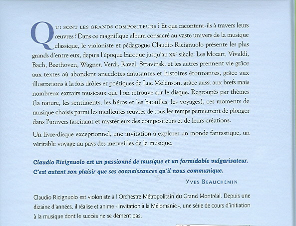 QUI SONT LES GRANDS COMPOSITEURS? Et que racontent-ils à travers leurs oeuvres? Dans ce magnifique album consacré au vaste univers de la musique classique, le violoniste et pédagogue Claudio Ricignuolo présente les plus grands d'entre eux, depuis l'époque baroque jusqu'au xxe siècle. Les Mozart, Vivaldi, Bach, Beethoven, Wagner, Verdi, Ravel, Stravinski et les autres prennent vie grâce aux textes où abondent anecdotes amusantes et histoires étonnantes, grâce aux illustrations à la fois drôles et poétiques de Luc Melanson, grâce aussi aux brefs mais nombreux extraits musicaux que l'on retrouve sur le disque. Regroupés par thèmes (la nature, les sentiments, les héros et les batailles, les voyages), ces moments de musique choisis parmi les meilleures oeuvres de tous les temps permettent de plonger dans l'univers fascinant et mystérieux des compositeurs et de leurs créations. Un livre,disque exceptionnel, une invitation à explorer un monde fantastique, un véritable voyage au pays des merveilles de la musique. Claudio Ricignuolo est un passionné de musique et un formidable vulgarisateur. C'est autant son plaisir que ses connaissances qu'il nous communique. YVES BEAUCHEMIN Claudio Ricignuolo est violoniste à l'Orchestre Métropolitain du Grand Montréal. Depuis une dizaine d'années, il réalise et anime« Invitation à la Mélomanie», une série de cours d'initiation à la musique dont le succès ne se dément pas.