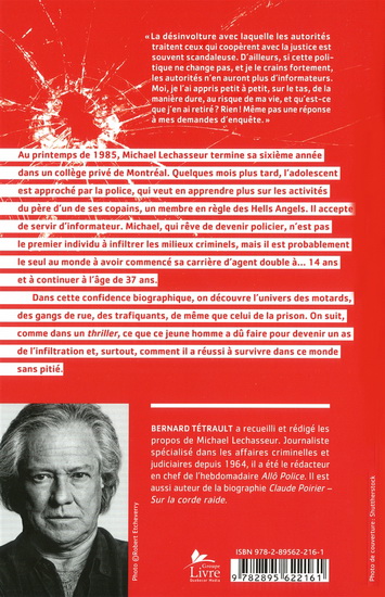 Dans ce témoignage, Bernard Tétrault raconte comment, adolescent, il fut aspiré dans ce tourbillon alors qu'il rêvait de devenir un grand policier: «J'étais les oreilles et les yeux de la police... je me disais, dans ma tête d'ado, que je finirais par avoir un badge, que je deviendrais moi-même policier. Plus besoin d'aller à l'école, j'avais déjà une paye. Je ne voyais pas les conséquences...» Et les missions sont devenues de plus en plus importantes. Voici le récit d'un dur dans un monde de durs. En le recrutant très jeune, on lui a volé son identité pour toujours. Aujourd'hui, il doit se cacher à l'étranger.