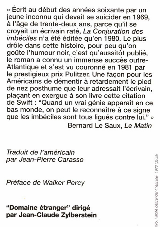 À trente ans passés, Ignatus vit encore cloîtré chez sa mère, à La Nouvelle-Orléans. Harassée par ses frasques, celle-ci le somme de trouver du travail. C'est sans compter avec sa silhouette éléphantesque et son arrogance bizarre... Chef-d'oeuvre de la littérature américaine, La Conjuration des imbéciles offre le génial portrait d'un Don Quichotte yankee inclassable, et culte.