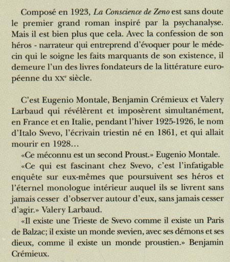 La conscience de zeno . Composé en 1923, La Conscience de Zeno est sans doute le premier grand roman inspiré par la psychanalyse. Mais il est bien plus que cela. Avec la confession de son héros - narrateur qui entreprend d'évoquer pour le médecin qui le soigne les faits marquants de son existence -, il demeure l'un des livres fondateurs de la littérature européenne du XXe siècle. Ce qui est fascinant chez Svevo, c'est l'infatigable enquête sur eux-mêmes que poursuivent ses héros et l'éternel monologue intérieur auquel ils se livrent sans jamais cesser d'observer autour d'eux, sans jamais cesser d'agir. Valery Larbaud. Il existe une Trieste de Svevo comme il existe un Paris de Balzac ; il existe un monde svevien, avec ses démons et ses dieux, comme il existe un monde proustien. Benjamin Crémieux.