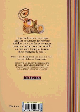 La petite Josette et son papa adorent se raconter des histoires farfelues dont tous les personnages portent le même nom par exemple, ou bien dans lesquelles tous les mots changent de sens.... Deux contes d'Eugène Ionesco à lire et à relire : un régal de lecture à haute voix.. Retrouvez les illustrations puissantes et originales d'Etienne Delessert dans Comment la souris reçoit une pierre sur la tête et découvre le monde.. Dès 4 ans.