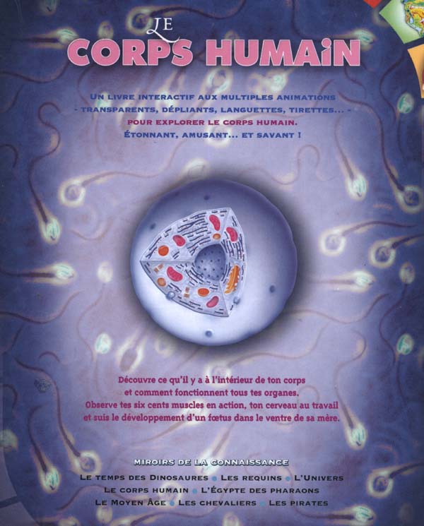 Un livre interactif aux multiples animations -transparents, dépliants, languettes, tirettes... Pour explorer le corps humain. Etonnant, amusant... et savant ! Découvre ce qu'il y a à l'intérieur de ton corps et comment fonctionnent tous tes organes. Observe tes six cent muscles en action, ton cerveau au travail et suis le développement d'un fœtus dans le ventre de sa mère.