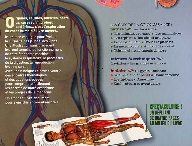 Organes, cellules, muscles, nerfs, os, cerveau, microbes, bactéries... c'est l'exploration du corps humain à livre ouvert. Ici, tout se conjugue pour éveiller la curiosité des jeunes, dès 9 ans. Une illustration sans précédent les rend témoins du fonctionnement de cette étonnante machine le système respiratoire, le processus de la digestion, ta reproduction, les cinq sens... Avec une rubrique Le saviez-vous ?, des encadrés thématiques et des questions posées pour comprendre facilement les secrets de notre organisme et tes progrès de la médecine. Un étonnant livre-document pour s'enrichir encore et encore !