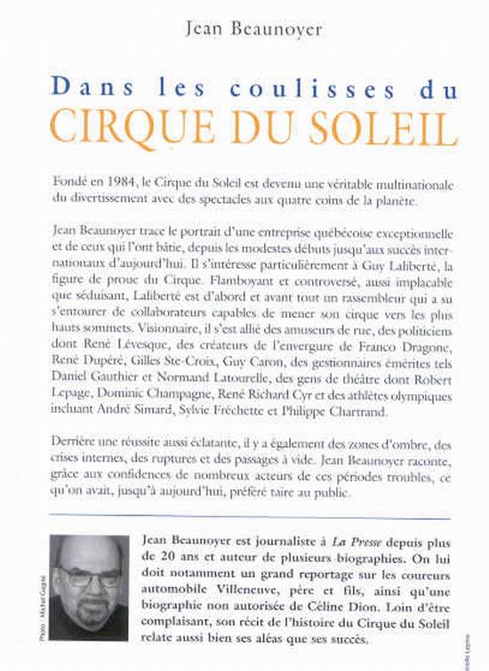 Fondé en 1984, le Cirque du Soleil est devenu une véritable multinationale du divertissement avec des spectacles aux quatre coins de la planète. Jean Beaunoyer trace le portrait d'une entreprise québécoise exceptionnelle et de ceux qui l'ont bâtie, depuis les modestes débuts jusqu'aux succès internationaux d'aujourd'hui. Il s'intéresse particulièrement à Guy Laliberté, la figure de proue du Cirque. Flamboyant et controversé, aussi implacable que séduisant, Laliberté est d'abord et avant tout tuf rassembleur qui a su s'entourer de collaborateurs capables de mener son cirque vers les plus hauts sommets. Visionnaire, il s'est allié des amuseurs de rue, des politiciens dont René Levesque, des créateurs de l'envergure de Franco Dragone, René Dupéré, Gilles Ste-Croix, Guy Caron, des gestionnaires émérites tels Daniel Gauthier et Normand Latourelle, des gens de théâtre dont Robert Lepage, Dominic Champagne, René Richard Cyr et des athlètes olympiques incluant André Simard, Sylvie Fréchette et Philippe Chartrand. Derrière une réussite aussi éclatante, il y a également des zones d'ombre, des crises internes, des ruptures et des passages à vide. Jean Beaunoyer raconte, grâce aux confidences de nombreux acteurs de ces périodes troubles, ce qu'on avait, jusqu'à aujourd'hui, préféré taire au public.