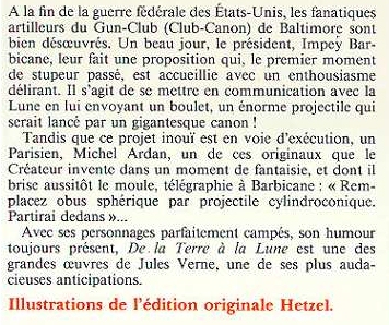 Un beau jour, le président, Impey Barbicane, leur fait une proposition qui, le premier moment de stupeur passé, est accueillie avec un enthousiasme délirant. Il s'agit de se mettre en communication avec la Lune en lui envoyant un boulet, un énorme projectile qui serait lancé par un gigantesque canon ! Tandis que ce projet inouï est en voie d'exécution, un Parisien, Michel Ardan, un de ces originaux que le Créateur invente dans un moment de fantaisie, et dont il brise aussitôt le moule, télégraphie à Barbicane : " Remplacez obus sphérique par projectile cylindroconique.
