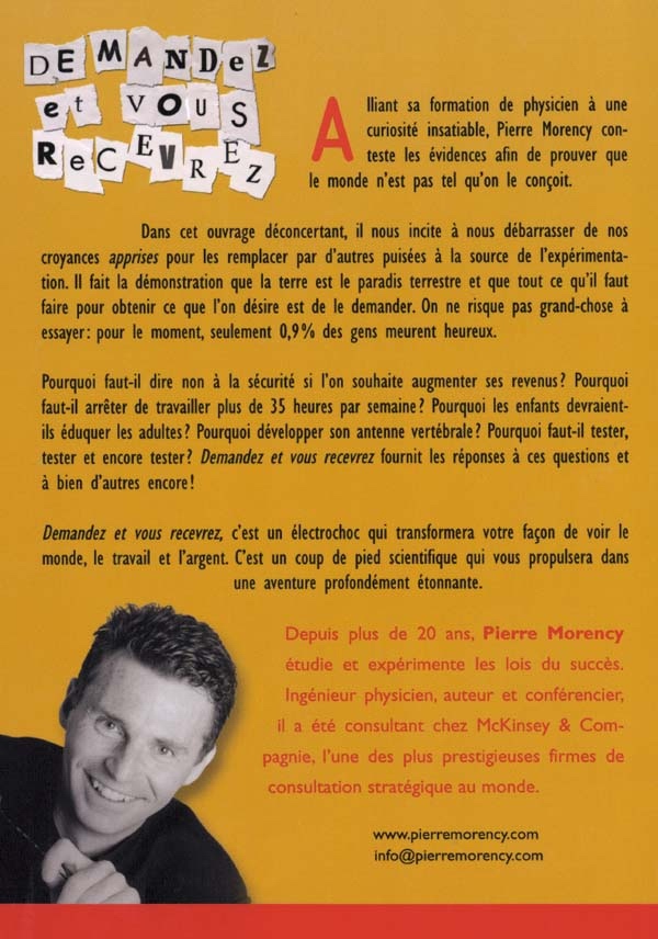 DEMANDEZ ET VOUS RECEVREZ, c'est un électrochoc qui transformera votre façon de voir le monde, le travail et l'argent. C'est un coup de pied scientifique qui vous propulsera dans une aventure profondément étonnante.