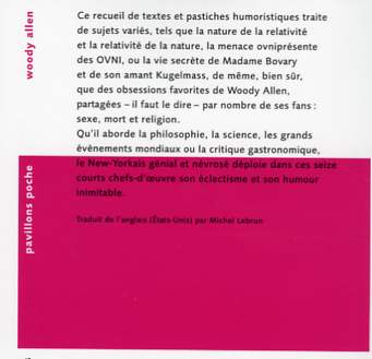 Ce recueil de textes et pastiches humoristiques traite de sujets variés, tels que la nature de la relativité et la relativité de la nature, la menace ovniprésente des OVNI, ou la vie secrète de Madame Bovary et de son amant Kugelmass, de même, bien sûr, que des obsessions favorites de Woody Allen, partagées -il faut le dire- par nombre de ses fans sexe, mort et religion. Qu'il aborde la philosophie, la science, les grands évènements mondiaux ou la critique gastronomique, le New-Yorkais génial et névrosé déploie dans ces seize courts chefs-d'œuvre son éclectisme et son humour inimitable.