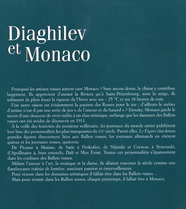 Pourquoi les artistes russes aiment tant Monaco ? Sans aucun doute, le climat y contribue largement. Ils apprécient d'autant la Riviera qu'à Saint-Pétersbourg, sous la neige, ils subissent de plein fouet la rigueur de l'hiver avec ses - 25 °C et ses 18 heures de nuit. Une autre raison est évidemment la passion des Russes pour le jeu ; d'ailleurs le métier d'artiste n'est-il pas une sorte de jeu " de l'amour et du hasard " ? Ensuite, Monaco garde le secret d'une douceur de vivre mêlée à un élan artistique, mélange que les danseurs des Ballets russes ont été avides de découvrir en 1911. À la veille des festivités du troisième millénaire, les journaux du monde entier publièrent leur liste des personnalités les plus marquantes du XXe siècle. Parmi elles, Le Figaro cita douze grandes figures directement liées aux Ballets russes, les journaux allemands en citèrent quinze et les journaux russes, quatorze. De Picasso à Matisse, de Satie à Prokofiev, de Nijinski et Cocteau à Stravinski, d'Apollinaire à, bien entendu, Dali et Max Ernst. Toutes ces personnalités s'épanouirent dans les coulisses des Ballets russes. Mêlant l'amour à l'art, la musique et la danse, ils allaient traverser le siècle comme une flamboyante traînée de lumière, suscitant passion et émerveillement. Pour réussir dans les domaines artistiques il fallait être dans les Ballets russes... Mais pour réussir dans les Ballets russes, chaque printemps, il fallait être à Monaco.