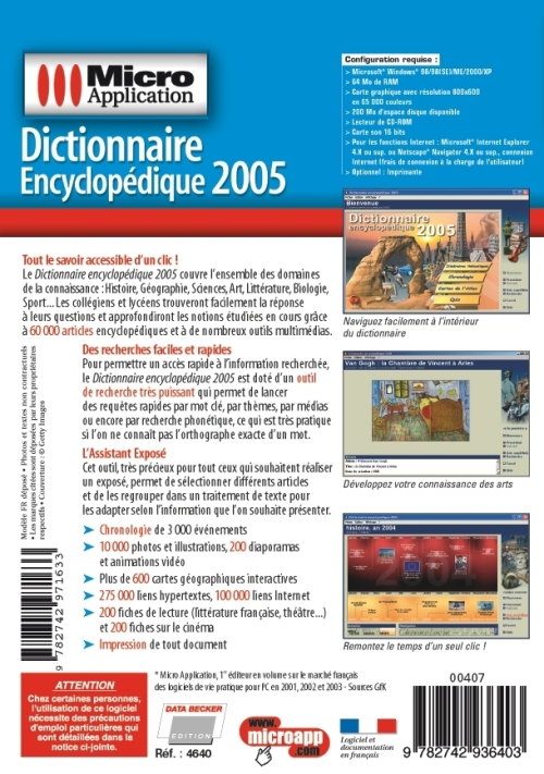 Le Dictionnaire encyclopédique 2005 couvre l'ensemble des domaines de la connaissance : histoire, géographie, sciences, arts, littérature, biologie, sport... Les collégiens et lycéens trouveront facilement la réponse à leurs questions et approfondiront les notions étudiées en cours grâce à 60 000 articles encyclopédiques et à de nombreux outils multimédias.