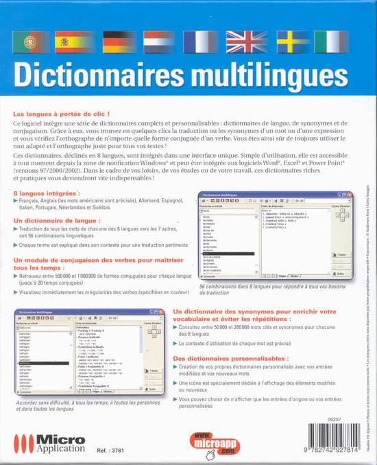 3 dictionnaires (dictionnaires de langue, des synonymes et de conjugaison) déclinés en 8 langues :français, anglais (GB/US), allemand, espagnol, italien, portugais, hollandais et suédois.