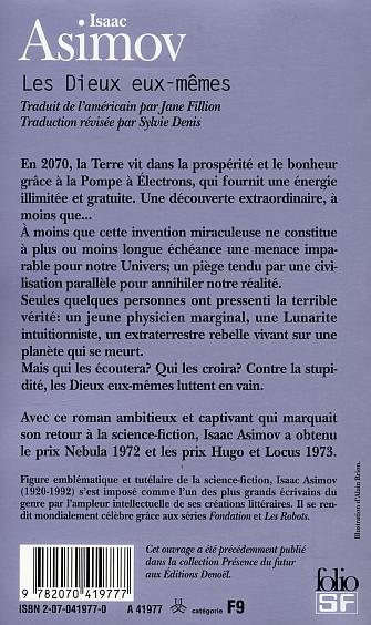 En 2070, la Terre vit dans la prospérité et le bonheur grâce à la Pompe à Electrons, qui fournit une énergie illimitée et gratuite. Une découverte extraordinaire, à moins que.... A moins que cette invention miraculeuse ne constitue à plus ou moins longue échéance une menace imparable pour notre Univers ; un piège tendu par une civilisation parallèle pour annihiler notre réalité.. Seules quelques personnes ont pressenti la terrible vérité : un jeune physicien marginal, une Lunarite intuitionniste, un extraterrestre rebelle vivant sur une planète qui se meurt.. Mais qui les écoutera ? Qui les croira ? Contre la stupidité, les Dieux eux-mêmes luttent en vain.. Avec ce roman ambitieux et captivant qui marquait son retour à la science-fiction, Isaac Asimov a obtenu le prix Nebula 1972 et les prix Hugo et Locus 1973..