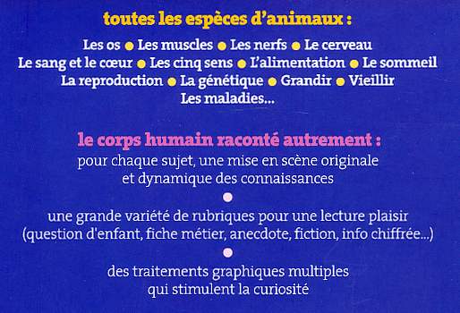 Le corps humain raconté autrement : pour chaque sujet, une mise en scène originale et dynamique des connaissances. Une grande variété de rubriques pour une lecture plaisir (question d'enfant, fiche métier, anecdote, fiction, info chiffrée...). Des traitements graphiques multiples qui stimulent la curiosité.