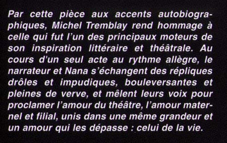 Par cette pièce aux accents autobiographiques, Michel Tremblay rend hommage à celle qui fut l’un des principaux moteurs de son inspiration littéraire et théâtrale. Au cours d’un seul acte au rythme allègre, le narrateur et Nana s’échangent des répliques drôles et impudiques, bouleversantes et pleines de verve, et mêlent leurs voix pour proclamer l’amour du théâtre, l’amour maternel et filial, unis dans une même grandeur et un amour qui les dépasse : celui de la vie..