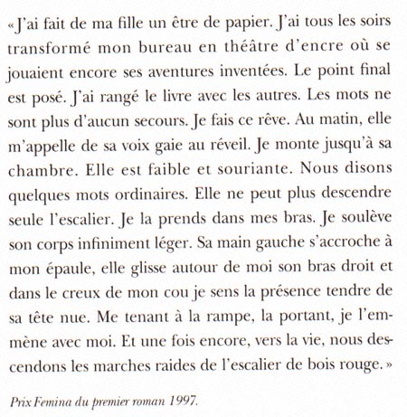 "J'ai fait de ma fille un être de papier. J'ai tous les soirs transformé mon bureau en théâtre d'encre où se jouaient encore ses aventures inventées. (...) Au matin, elle m'appelle de sa voix gaie au réveil. (...) Elle ne peut plus descendre seule l'escalier. Je la prends dans mes bras."