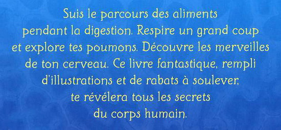 Suis le parcours des aliments pendant la digestion. Respire un grand coup et explore les poumons. Découvre les merveilles de ton cerveau. Ce livre fantastique, rempli d’illustrations et de rabats à soulever, te révélera tous les secrets du corps humain.