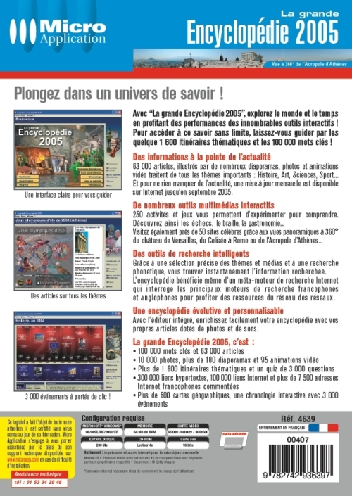 Des informations à la pointe de l’actualité 63 000 articles, illustrés par de nombreux diaporamas, photos et animations vidéo traitent de tous les thèmes importants. L’histoire, les arts, la technologie, mais aussi les sciences et le sport sont au rendez-vous ! Et pour ne rien manquer de l’actualité, une mise à jour mensuelle est disponible sur Internet jusqu’en septembre 2005.