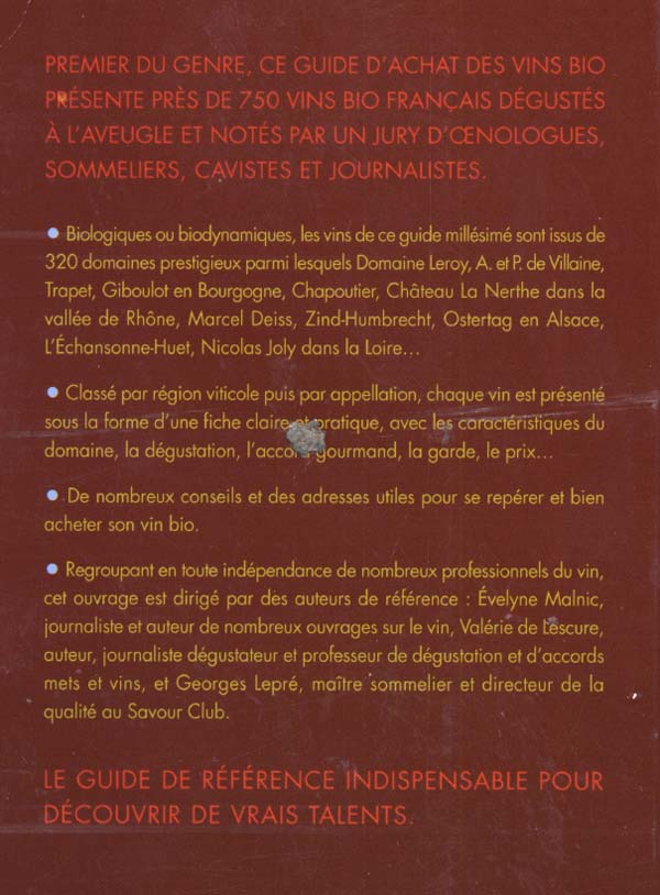 Premier du genre, ce guide d'achat des vins bio présente près de 750 vins bio français dégustés à l'aveugle et notés par un jury d'œnologue sommeliers, cavistes et journalistes. Biologiques ou biodynamiques, les vins de ce guide millésimé sont issus de 320 domaines prestigieux parmi lesquels Domaine Leroy, A. et P. de Villaine, Trapet, Giboulot en Bourgogne , Chapoutier, Château La Nerthe dans la vallée du Rhône, Marcel Deiss, Zind-Humbrecht, Ostertag en Alsace, l'Echansonne-Huet, Nicolas Joly dans la Loire... Classé par région viticole puis par appelation, chaque vin est présenté sous la forme d'une fiche claire et pratique, avec les caractéristiques du domaine, la dégustation, l'accord gourmand, la garde, le prix... De nombreux conseils et des adresses utiles pour se repérer et bien acheter son vin bio. Le guide de référence indispensable pour découvrir de vrais talents.