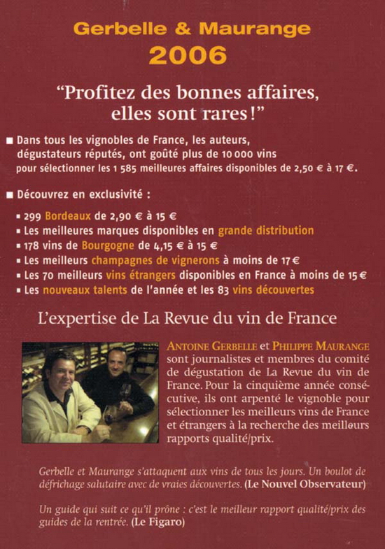 Dans tous les vignobles de France, les auteurs, dégustateurs réputés, ont goûté plus de 10 000 vins pour sélectionner les 1 585 meilleures affaires disponibles de 2,50 à 17 euros. Découvrez en exclusivité 299 Bordeaux de 2,90 à 15 euros, les meilleures marques disponibles en grande distribution, 178 vins de Bourgogne de 4,15 à 15 euros, les meilleurs champagnes et vins étrangers ainsi que les nouveaux talents de l'année.