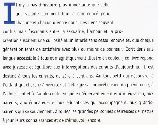 Il n’y a jamais eu de plus belle histoire que celle qui raconte comment tout a commencé pour chacune et chacun d’entre nous. Les liens souvent confus mais fascinants entre la sexualité, l’amour et la procréation suscitent une curiosité et un intérêt sans cesse renouvelés, que chaque génération tente de satisfaire avec plus ou moins de bonheur. Écrit dans une langue accessible à tous et magnifiquement illustré en couleur, ce livre répond avec justesse et équilibre aux interrogations des enfants d’aujourd’hui.